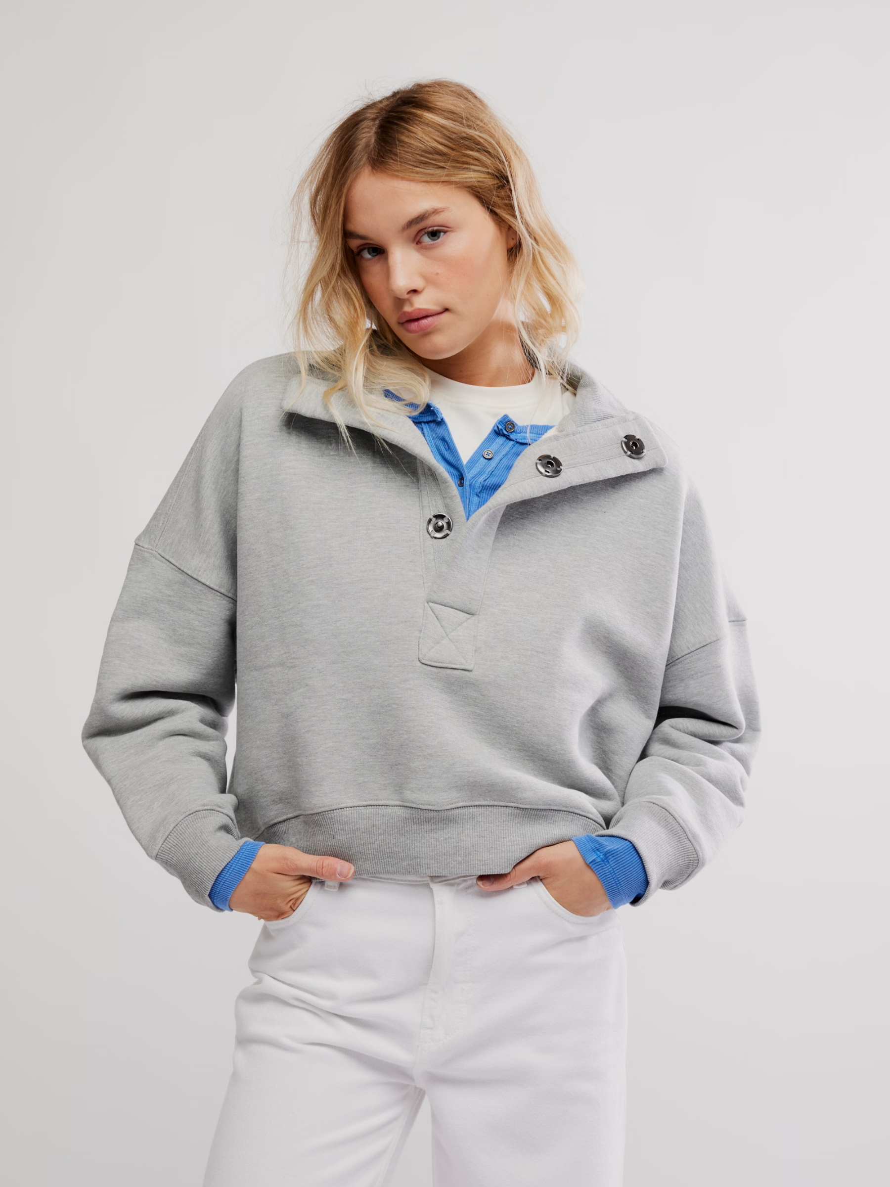Constructed with French terry, the Free People Timeless Pullover Sweatshirt features an oversized placket with snaps and dropped shoulders for a casual, relaxed look. A banded hem and sleeves, complete with rib trim, rounds out the style.
